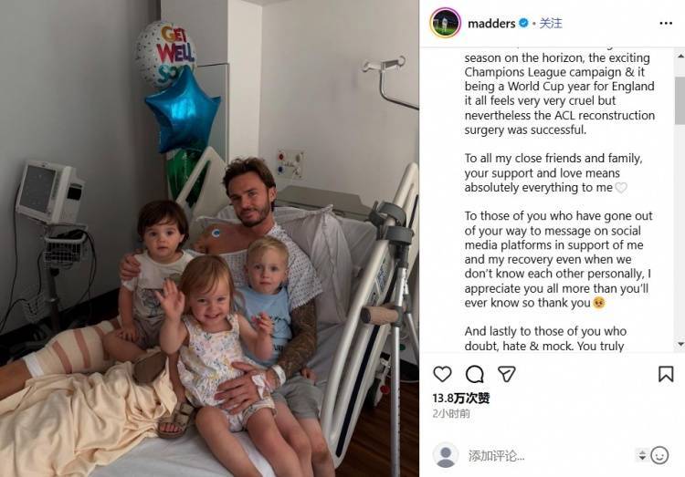 在社交媒体上,麦迪逊写道:我从未经历过如此的低谷!在这个关键时刻遭遇伤病让我心碎不已。明天就是欧超杯,英超新赛季也即将开启,我们也将迎来激动人心的欧冠征程。而且,今年是英格兰的世界杯年,这一切都显得格外残酷。不过,我的十字韧带重建手术非常成功。