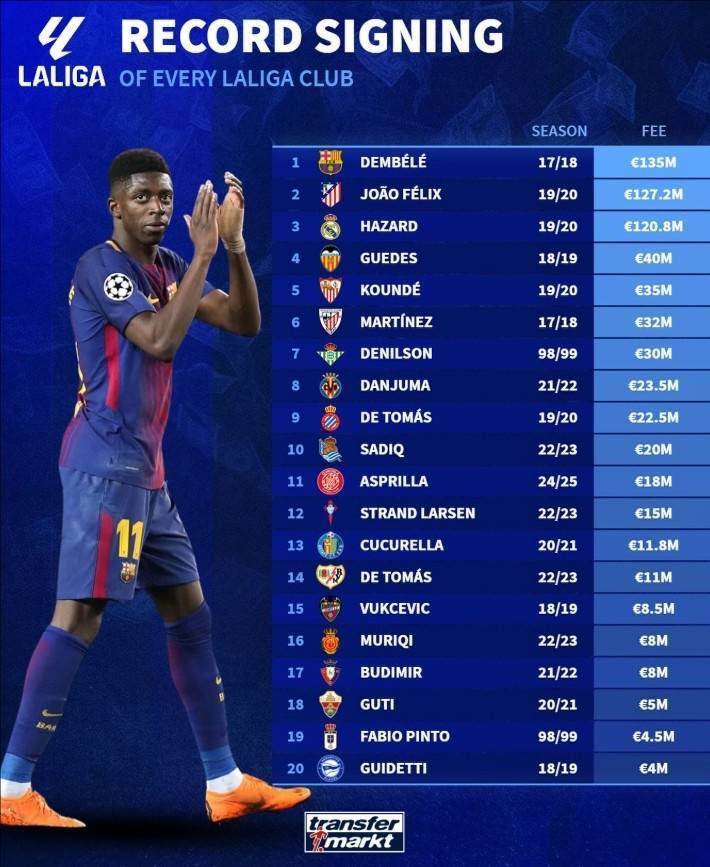西甲20队引援标王:登贝莱1.35亿居首,菲利克斯、阿扎尔紧随其后