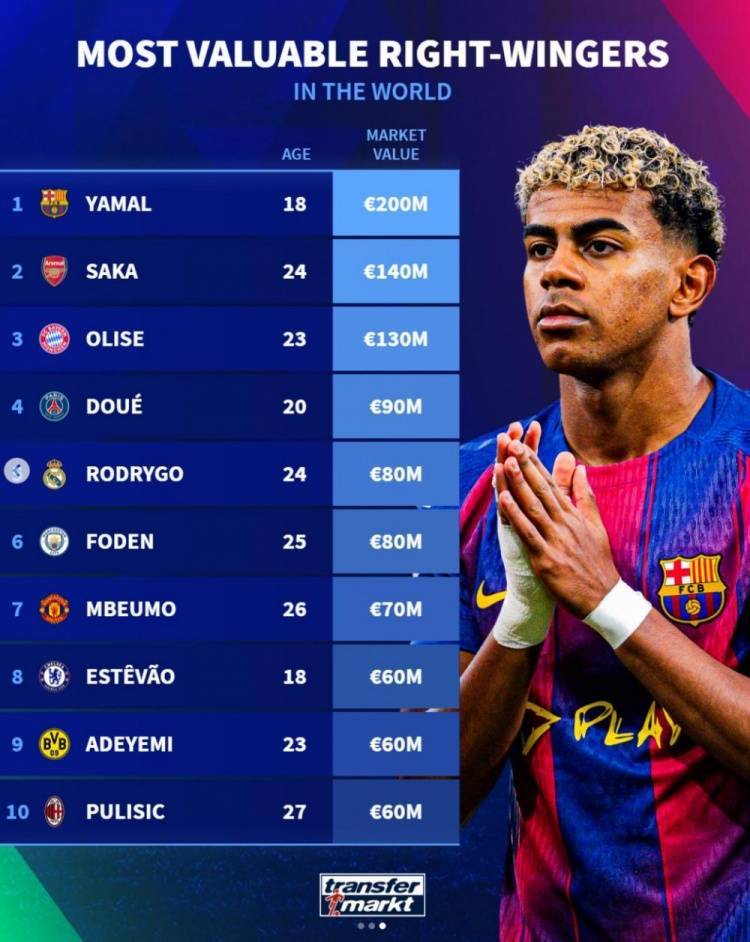 2 亿欧封王!亚马尔领跑右边锋身价榜,英超德甲新星紧追
