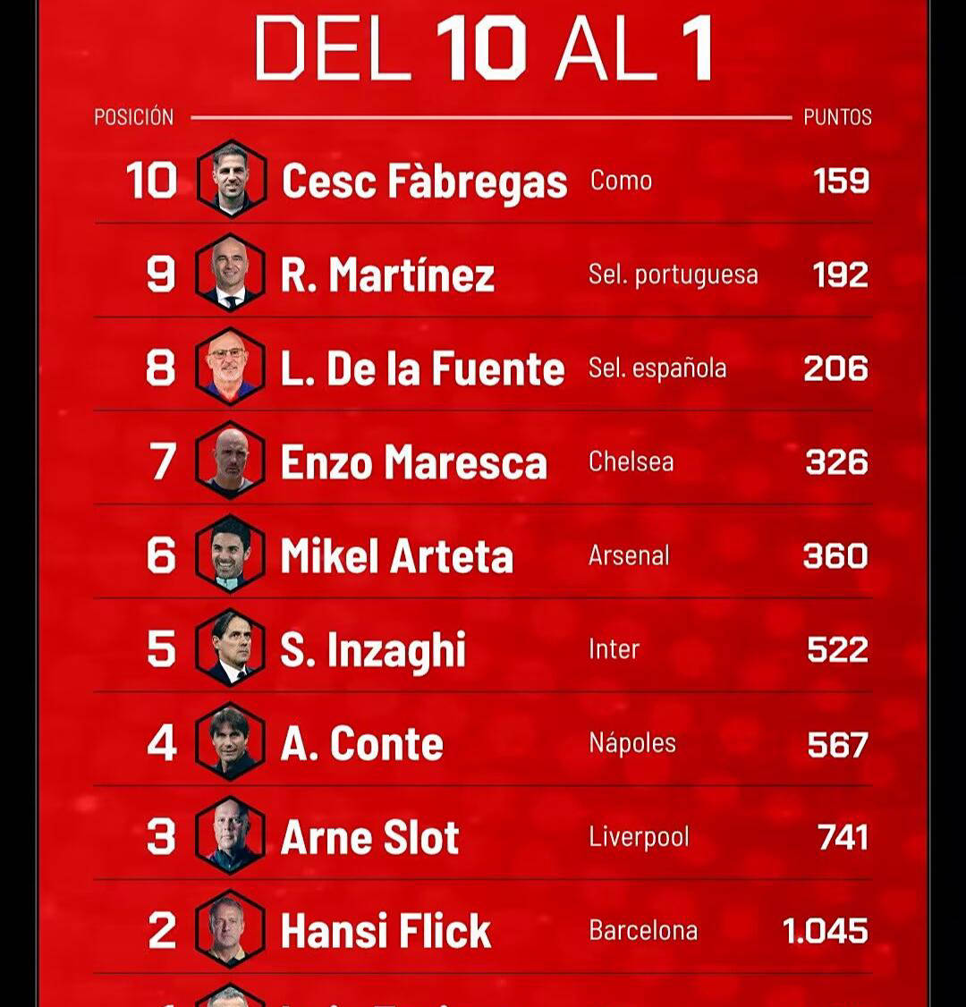 紧随其后的是巴萨主帅弗里克,以1045分位列第二。起初,弗里克接手巴萨时并未得到广泛认可,但他用实际行动证明了自己。红蓝军团在国内赛事中获得双冠,并成功跻身欧冠四强,这足以确保他在这份排行榜中的位置,实至名归。